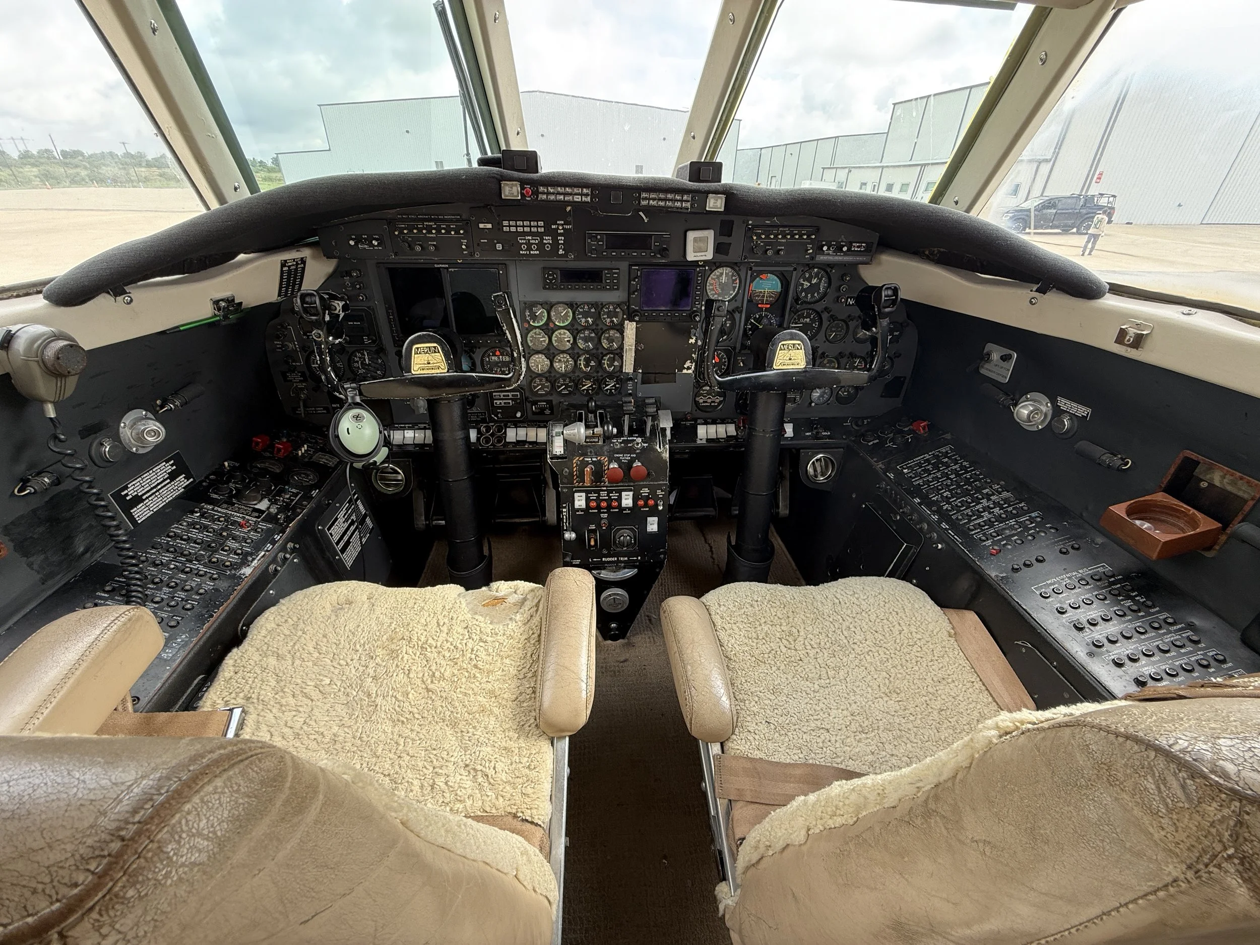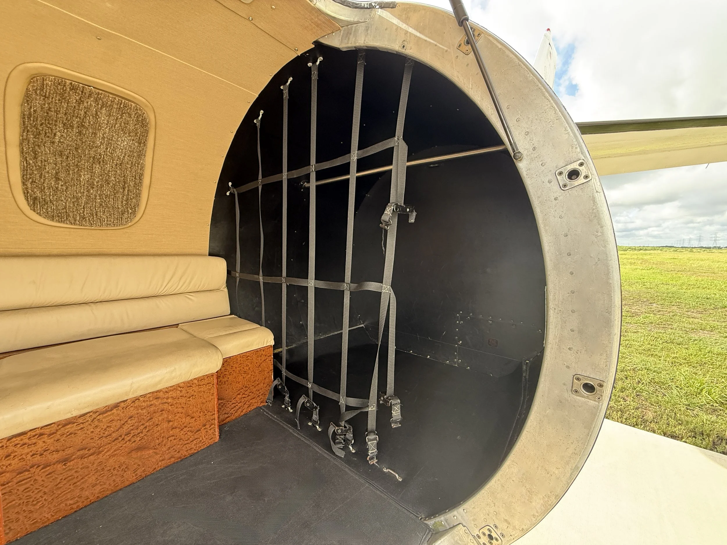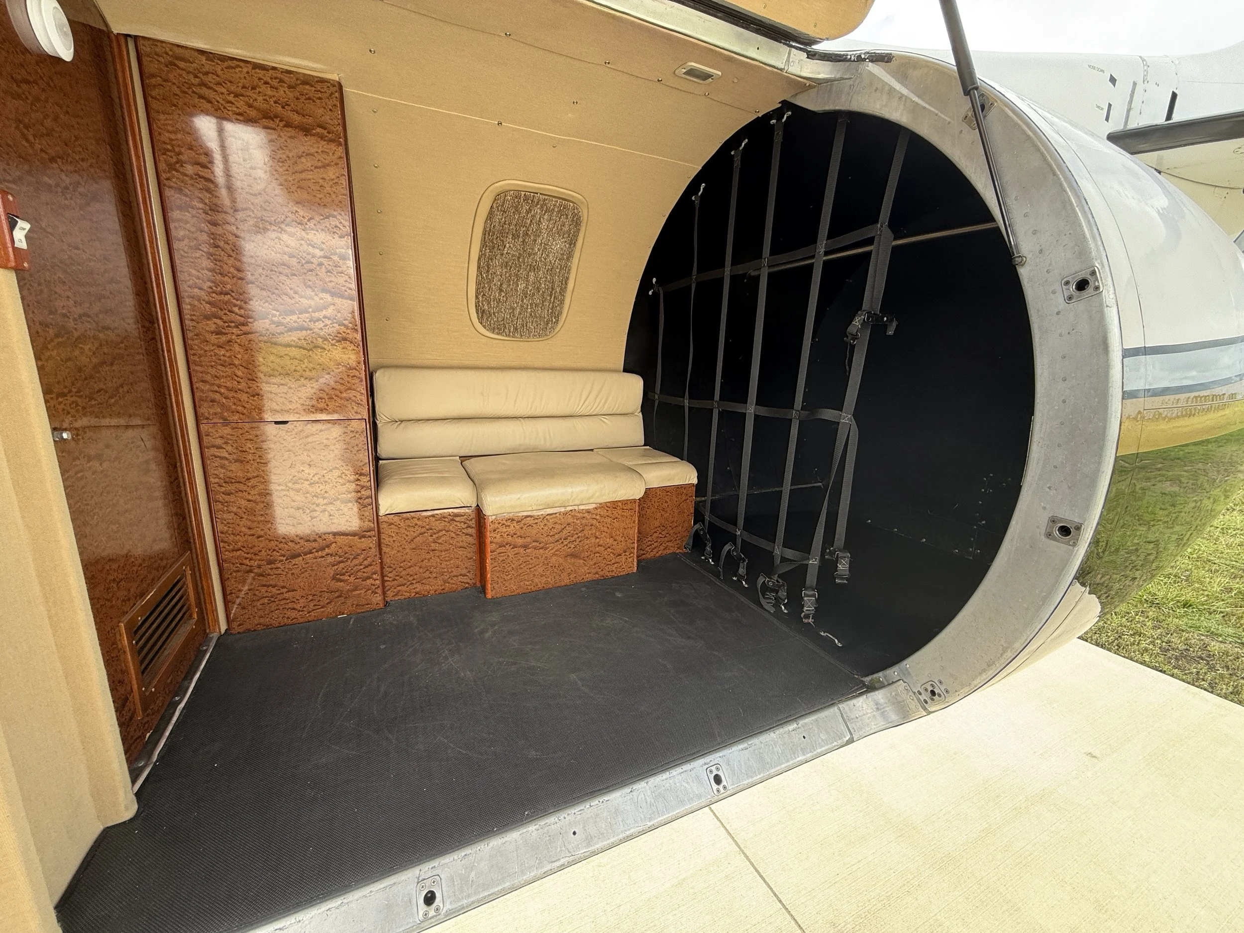 Inside, it’s configured for 12 passengers in a clean tan leather layout with club seating and a three-place divan. With the galley removed, the cabin feels more open and easier to move through—great for short legs and quick turns. And thanks to the large aft cargo door, loading gear or luggage is quick and painless. A fully enclosed lav adds comfort for longer missions.