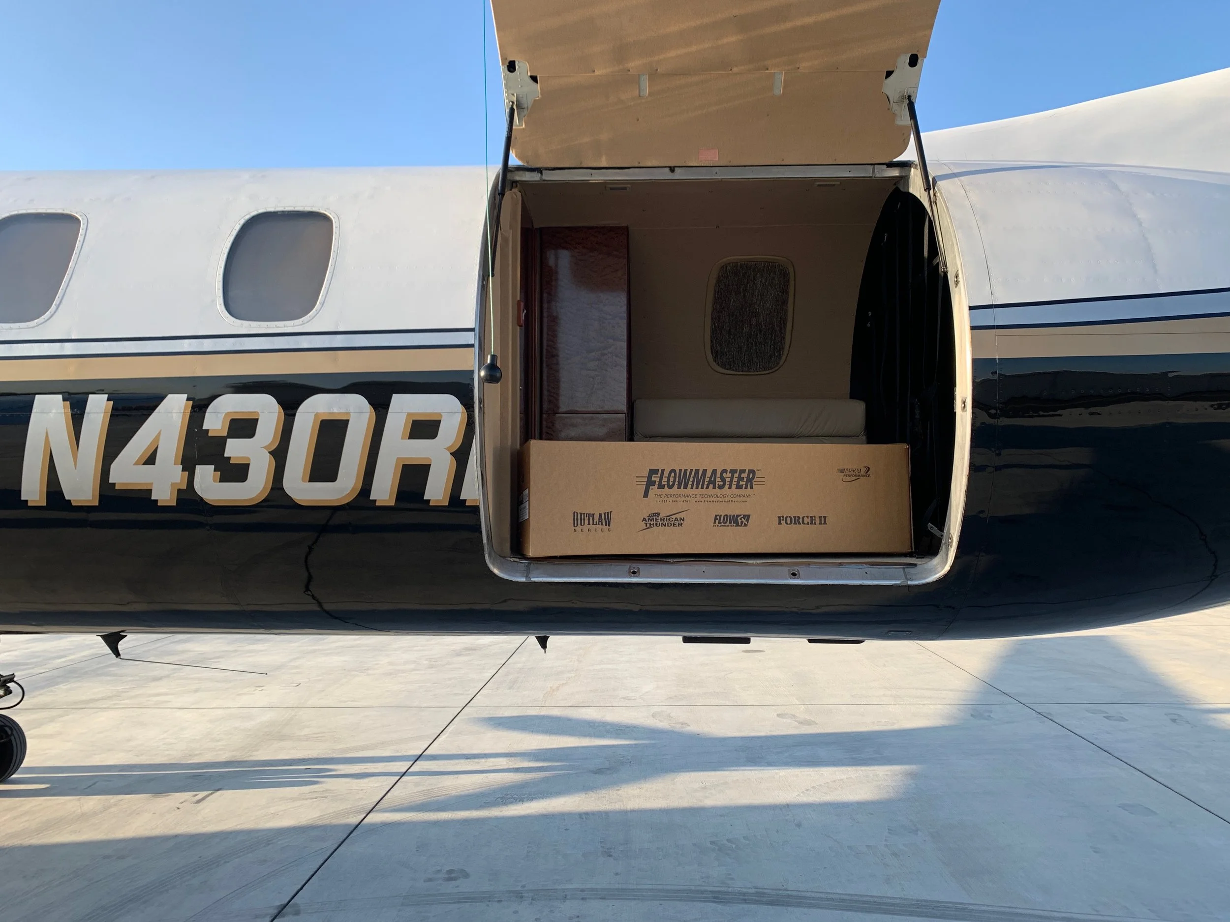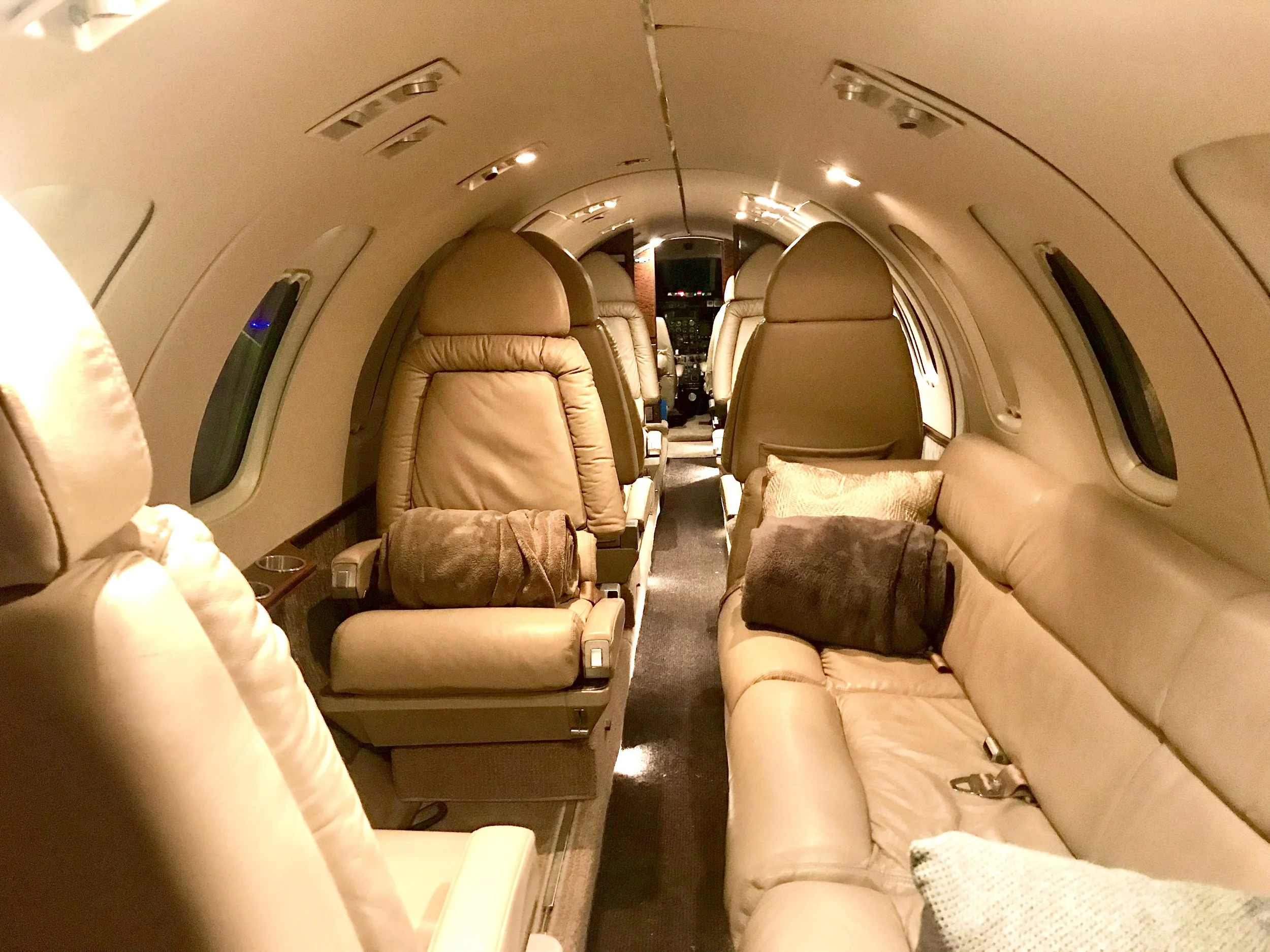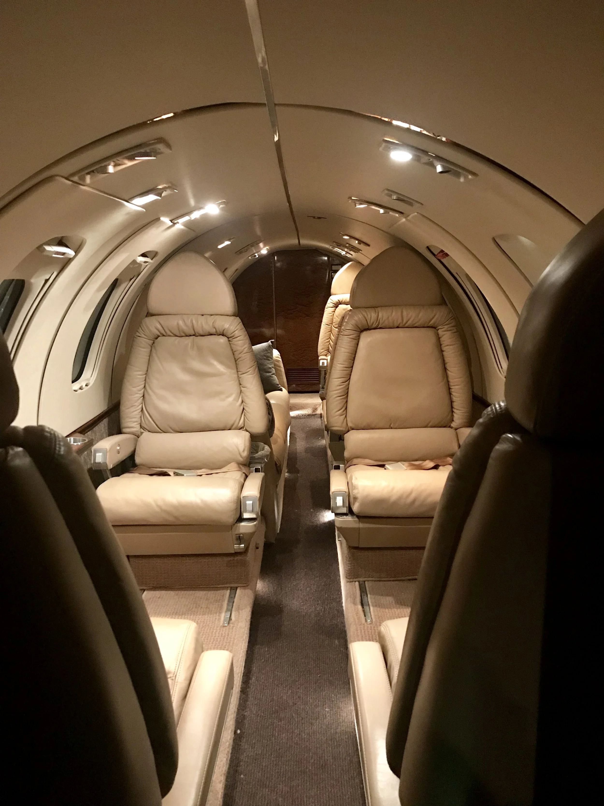 Inside, it’s configured for 12 passengers in a clean tan leather layout with club seating and a three-place divan. With the galley removed, the cabin feels more open and easier to move through—great for short legs and quick turns. And thanks to the large aft cargo door, loading gear or luggage is quick and painless. A fully enclosed lav adds comfort for longer missions.